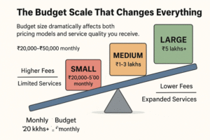 Budget size dramatically affects both pricing models and service quality you receive. Industry data shows small budgets (₹20,000-₹50,000 monthly) face different dynamics than medium (₹1-3 lakhs) or large budgets (₹5 lakhs+).